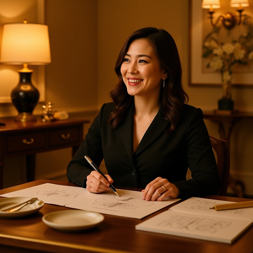 A vivid image portrays a content client immersed in the luxurious atmosphere of a premium design studio, surrounded by elegant sketches and high-end design elements. Soft, golden lighting bathes the scene, highlighting the client's serene expression as they admire the refined aesthetics and impeccable craftsmanship. The background features tasteful decor and sophisticated tools of the trade, emphasizing the service's exclusivity and artistry, all captured with a cinematic touch that evokes a sense of refinement and satisfaction.