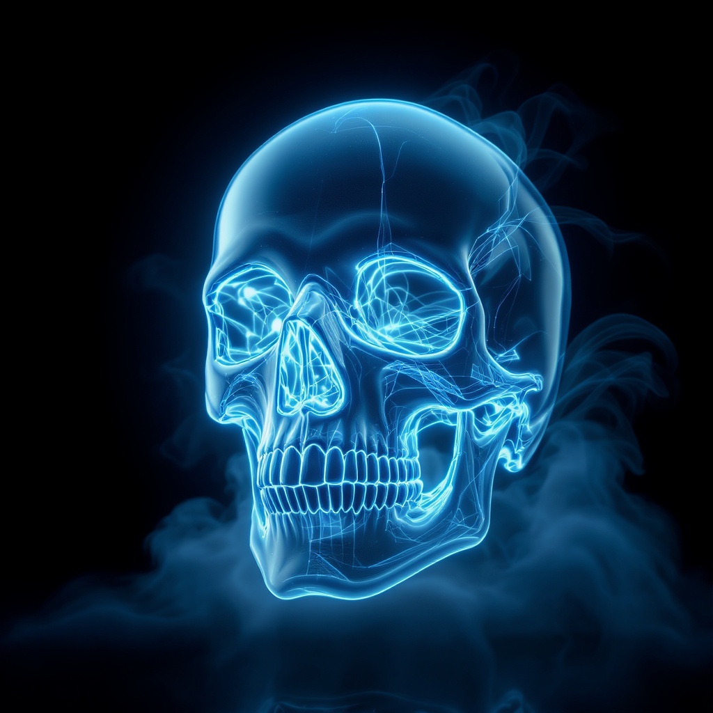 A hyper-realistic 3D image of a glass skull with subtle crystalline textures, illuminated by a pulsating neon blue light that radiates through its transparent form, casting intricate reflections and refractions. The skull is set against an infinite black void, enhancing its otherworldly glow. Rendered using the high-performance Octane engine, the scene captures a delicate balance of light and shadow, evoking a sense of eerie mystery and futuristic intrigue. Ethereal wisps of mist subtly surround the skull, giving the impression of it hovering in a weightless, otherworldly environment.