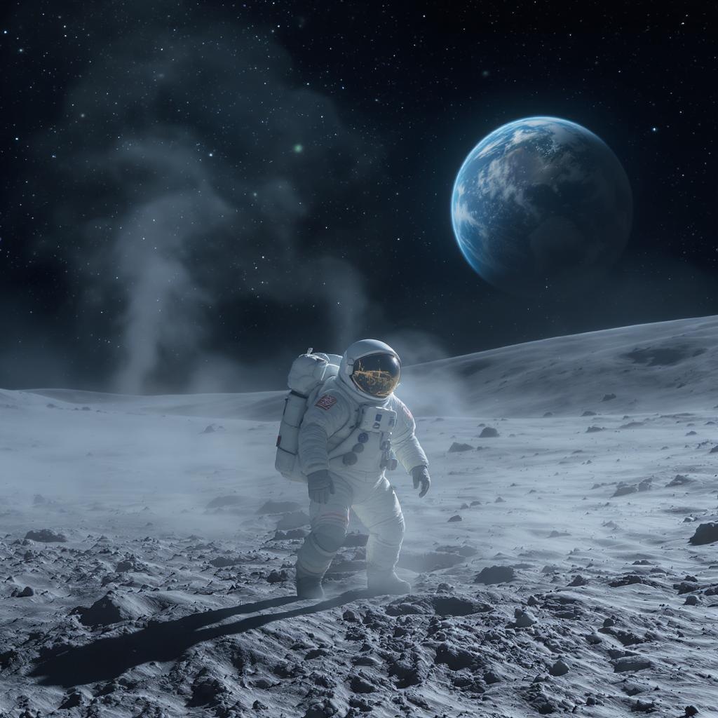 A detailed image of an astronaut standing on the moon's surface, set against a backdrop of a starry sky. The scene uses a cold color palette with muted blues and grays to convey the tranquility and isolation of space. The astronaut's suit is intricately detailed, with visible textures and reflections from the lunar dust. Earth is visible in the background, casting a soft glow on the scene, adding a touch of warmth to the otherwise cool landscape. Dust particles float gently around, adding depth and realism, creating a serene yet awe-inspiring atmosphere.