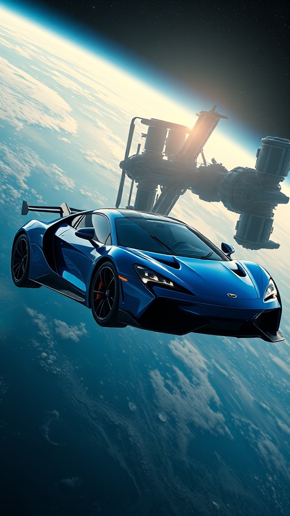 View this AI-generated image featuring a photorealistic image of a car in a weightless state its deep blue color contrasting against the vastness of space the car is approaching a space station with earth visible in the distance creating an awe inspiring composition insane details bring out the intr
