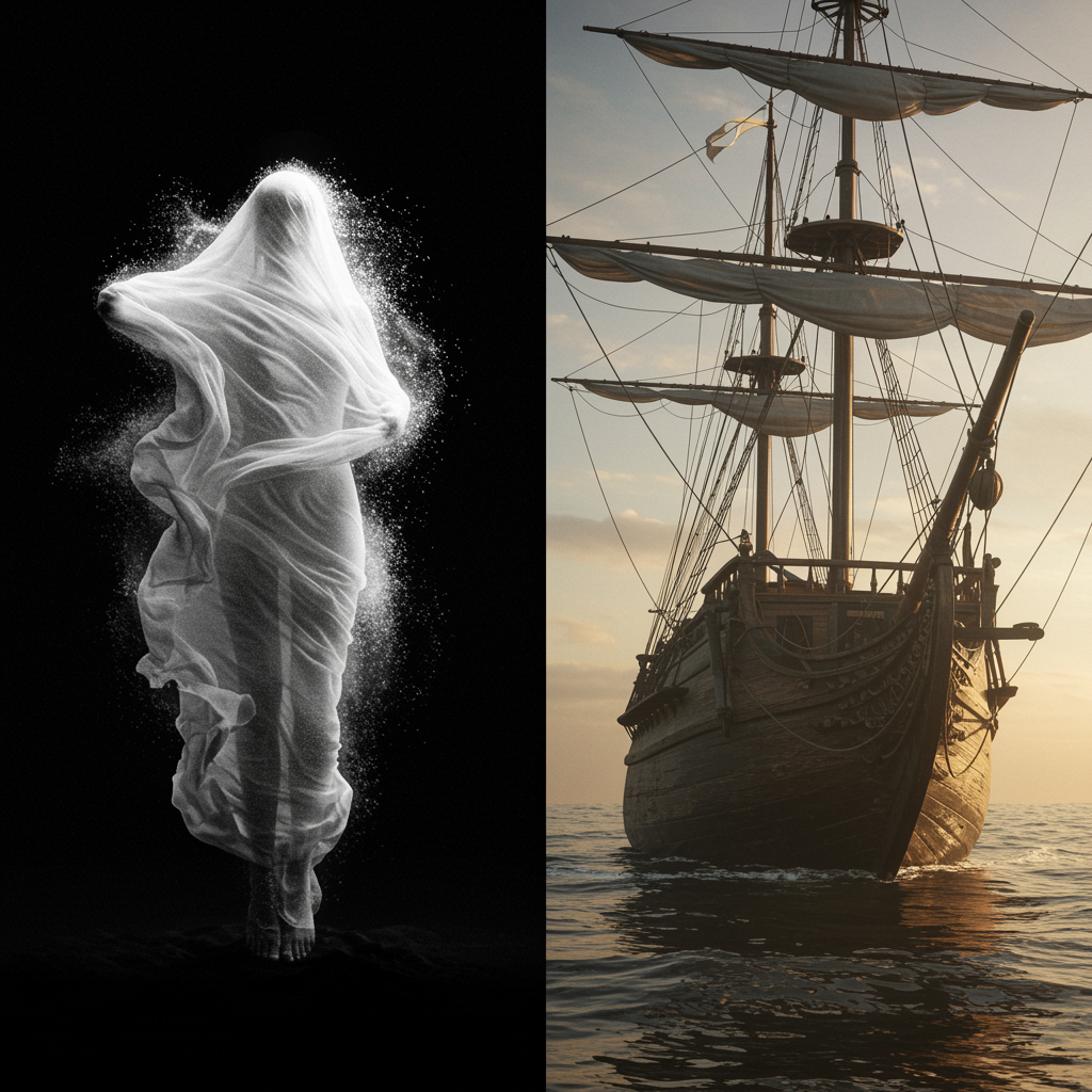 A mesmerizing image of a figure wrapped in a shroud-like material, appearing to merge seamlessly with the surrounding air, set against a stark contrast between a dark background and the radiant, luminous texture of the fabric, evoking a sense of emergence or transformation. The monochrome tones enhance the mysterious and intense atmosphere. Alongside, a breathtaking photo of an incredibly realistic sailing ship, captured in dramatic light during a pale sunrise. The scene is imbued with cinematic lighting, showcasing a weathered vessel from a low angle, trending on art platforms, rendered in stunning 4k hyper-realism. The intricate details and focused composition evoke the artistry reminiscent of Studio Ghibli and the intricate works of John William Turner, all crafted with the power of Unreal Engine 5.
