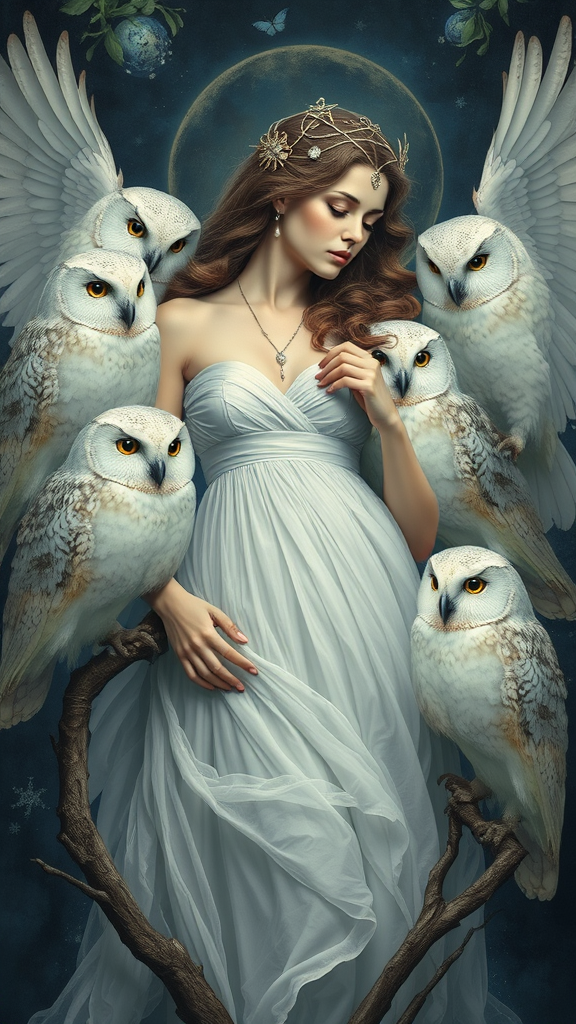 Images of a woman gracefully surrounded by owls, evoking an ethereal beauty reminiscent of fine porcelain with a palette of dark white and light azure. Influences of Clifford Coffin's striking style merge with the intricate detail of the Northern Renaissance. Subtle touches of white and amber enhance the scene's mystical aura, while the spirit of wiccan magic weaves through the composition, creating a captivating and otherworldly vision.