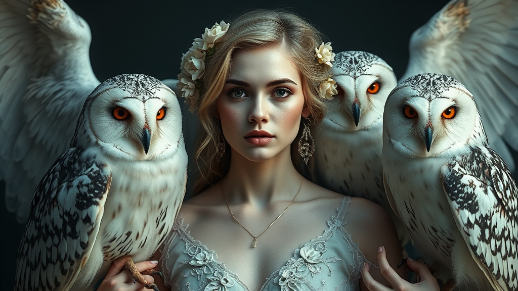 Images of a woman surrounded by her owls, capturing an ethereal beauty with porcelain-like skin. The palette features dark white and light azure hues, reminiscent of Clifford Coffin's photography style, while drawing inspiration from the Northern Renaissance. The scene incorporates touches of white and amber, exuding a mystical Wiccan aura. The composition creates a surreal atmosphere, blending elegance and mystery.