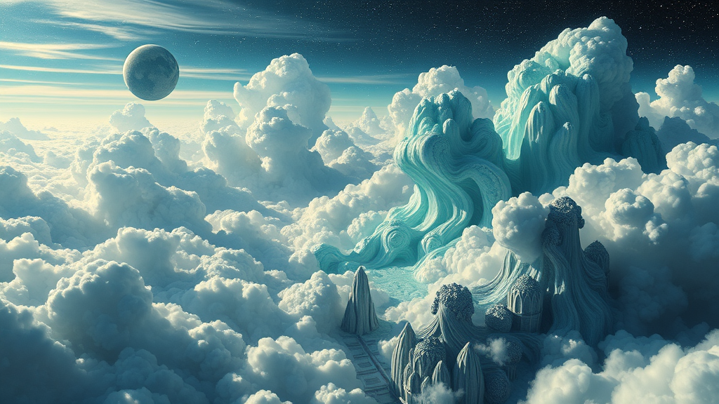Imaginative photo illustration of a celestial world suspended in the clouds, inspired by the visionary styles of Tanya Shatseva, the Stars art group, and Meghan Howland. Enriched with hues of dark indigo and light cyan, the scene is dotted with mind-bending, fluid sculptural forms, highlighting realistic hyper-details. A sense of fluid simplicity permeates the landscape, inviting viewers into a surreal and otherworldly experience.