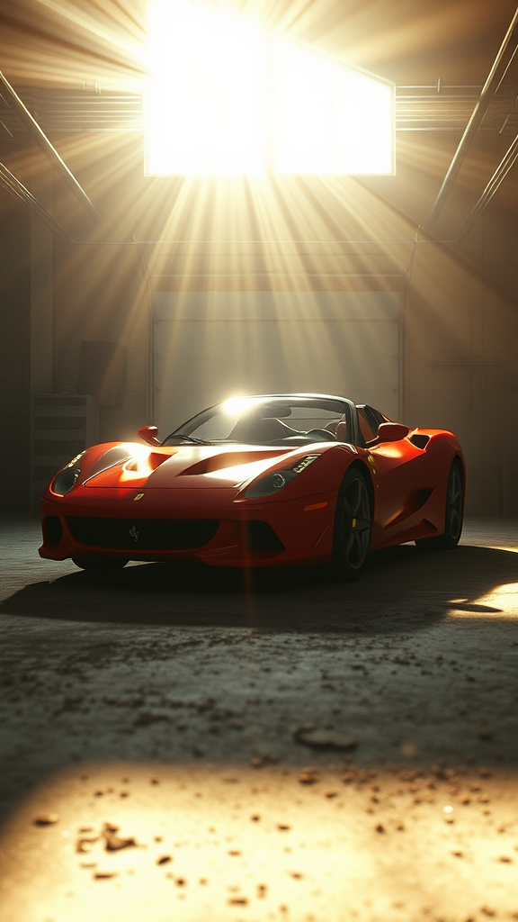 Imagine a 90's found footage-style ambiance with the nostalgic feel of VHS, characterized by film grain and noise. In a vast garage, a red Ferrari takes center stage, its sleek body highlighted by volumetric lighting that casts dramatic shadows across a layer of dust covering the cluttered, messy space. Soft, hazy lighting creates an ethereal atmosphere, with ultra-realistic details enhancing the scene's cinematic quality. Radiant light rays pierce through the garage windows, forming high-resolution patterns that dance across the Ferrari's surface, reminiscent of a finely crafted 3D render you might find on ArtStation. The scene is further enriched by matte textures and a concept art aesthetic, with a touch of exaggeration to emphasize the light's aesthetic appeal. Vintage magazine-style backlighting adds depth, producing magical lighting beams that illuminate particles of dust. The color of the light shifts subtly, creating an almost dreamlike quality. The composition is intriguing with some elements cropped or out-of-frame, mixing the realism of the setting with the playful imagination of a 2D cartoon or anime, as if a toy car were brought to life in this vivid, artistic vision.