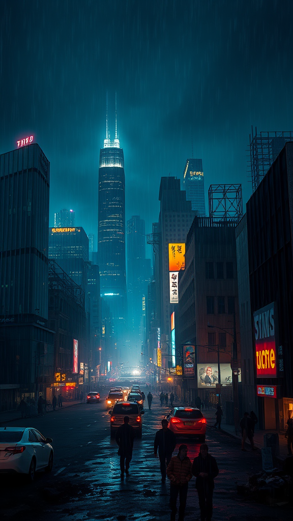 Imagine a breathtaking dystopian scene, where towering megacities cast long shadows over desolate wastelands, the skyline punctuated by gleaming skyscrapers in decay. Neon lights flicker amidst relentless rain, creating a hauntingly beautiful contrast against the darkened skies. Amidst this epic landscape, remnants of humanity navigate through vast streets, their silhouettes outlined by glowing billboards, telling stories of hope amidst ruin. The atmosphere exudes a sense of cinematic grandeur, capturing the relentless spirit of survival in a world transformed by time.