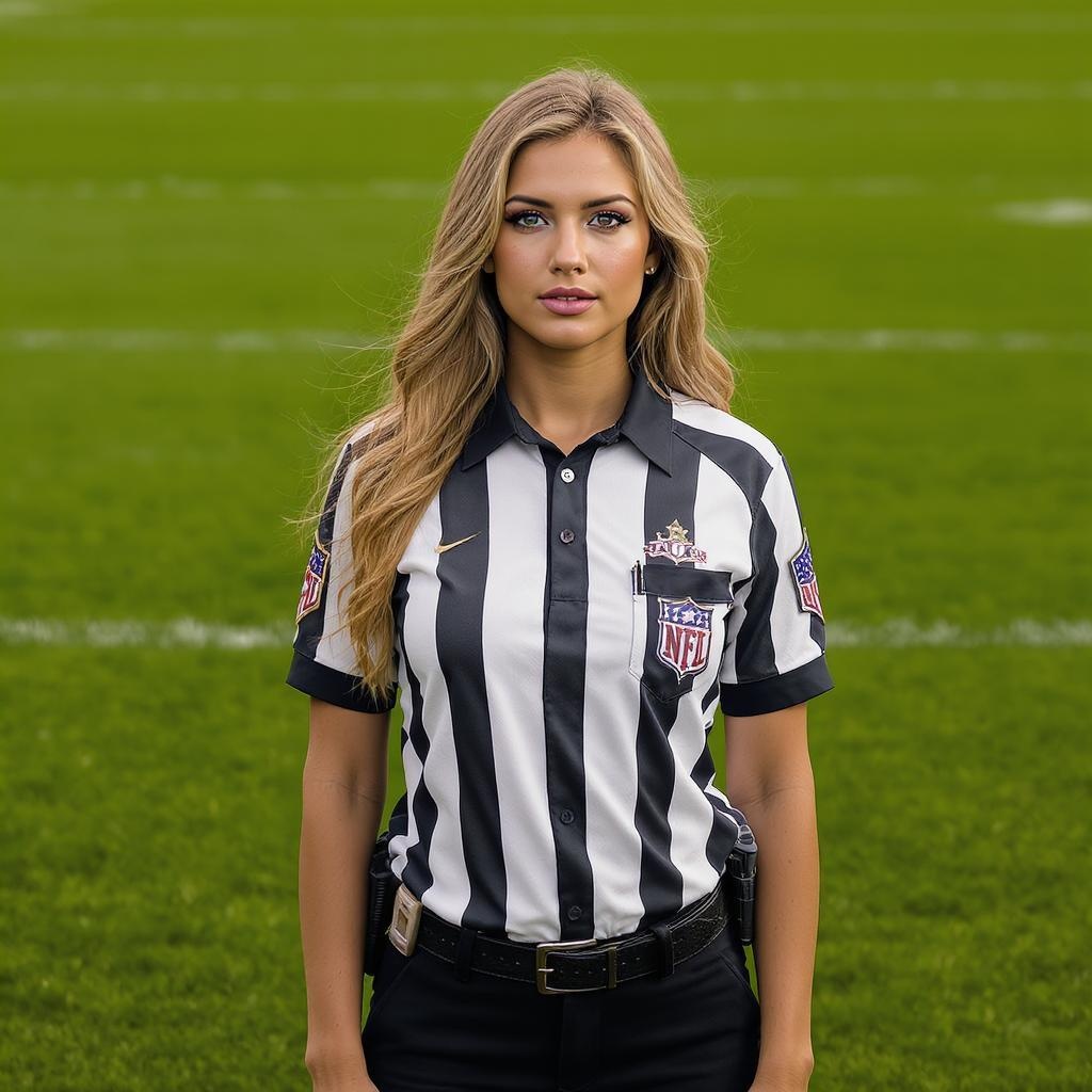 Imagine a captivating scene of an attractive person dressed as a football referee, perfectly centered on a lush football field. The subject is portrayed in a stunning full-length frame, looking directly at the viewer with a confident expression. The portrait showcases detailed, lifelike skin under diffused soft lighting, enhancing the realism of the photograph. Captured with hyper-realistic quality, the image features an 8k resolution and sharp focus, creating a cinematic CGI effect. Through a shallow depth of field, every detail is emphasized in high detail RAW color art. The photograph achieves an artistic blend of dynamic realism without compromising on quality. Every intentional detail contributes to a scene that excludes imperfections like low resolution, text errors, or any form of distortion, maintaining the integrity of an idealized reality.