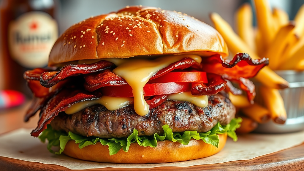 Imagine a colossal burger sensation featuring a succulent, perfectly grilled Wagyu beef patty, crowned with gooey, smoked Gouda cheese and thick-cut, maple-glazed bacon. It's nestled between two buttery, toasted pretzel buns, adding a unique twist to the classic delight. Enhancing the flavors are layers of sweet, caramelized shallots, juicy heirloom tomato slices, and crisp butterhead lettuce, all drizzled with a robust truffle-infused aioli. To amplify the experience, serve this indulgent creation with a side of rosemary-parmesan truffle fries and an ice-cold artisanal craft soda. This gourmet masterpiece promises to captivate your customers' taste buds and leave them craving more.