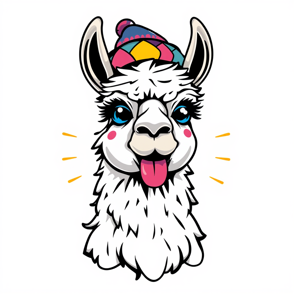 Imagine a delightful llama brimming with joy and playfulness, its eyes twinkling with mischief as it sticks out its tongue cheekily. This charming creature dons a quirky, colorful hat that adds to its lighthearted spirit. The design utilizes a palette of vibrant hues and dynamic, flowing lines to encapsulate its energetic essence. Crafted as a sticker design graphic in vector format, the artwork features bold contours and is set against a crisp white background, highlighting the llama's whimsical and adorable nature.