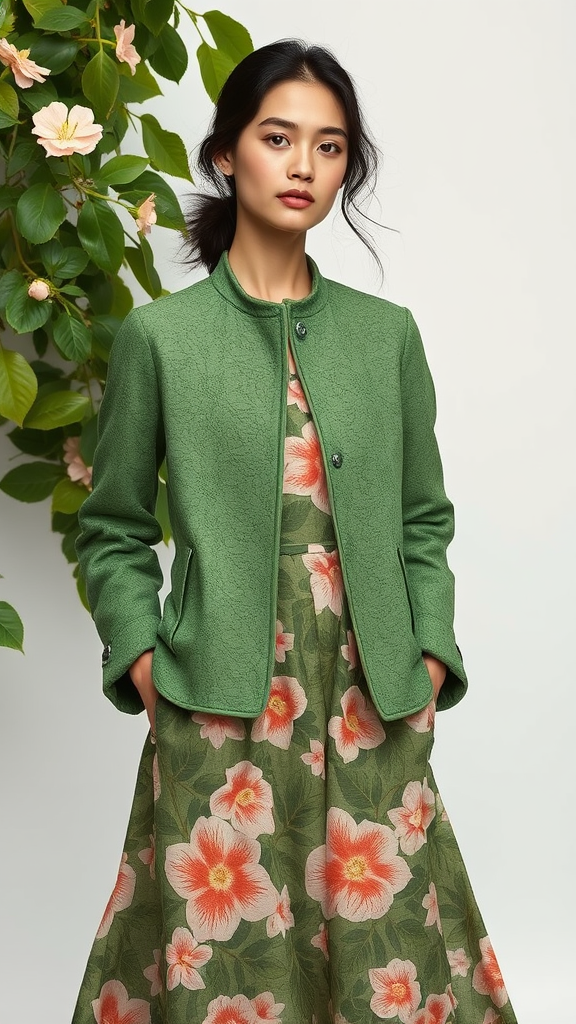 Imagine a fashion collection that embodies the sublime grace of botanical elements, where clothing designs seamlessly integrate intricate floral patterns, lush organic textures, and harmonious natural color palettes. Each piece in the collection reflects the enchanting allure of nature, translating delicate petals, verdant leaves, and serene landscapes into wearable art. Flowing dresses mimic the gentle sway of wildflowers in a breeze, while jackets and outerwear feature embossed patterns reminiscent of leaf veins, providing a tactile connection to the earth. Subtle tones of moss green, rose petal pink, and sky blue bring forth a palette that is both calming and invigorating. Sophistication is achieved through the use of luxurious, sustainable fabrics that mimic the soft touch of petals and the resilience of bark, ensuring that each garment not only captures nature's essence but also offers comfort and elegance in everyday wear.