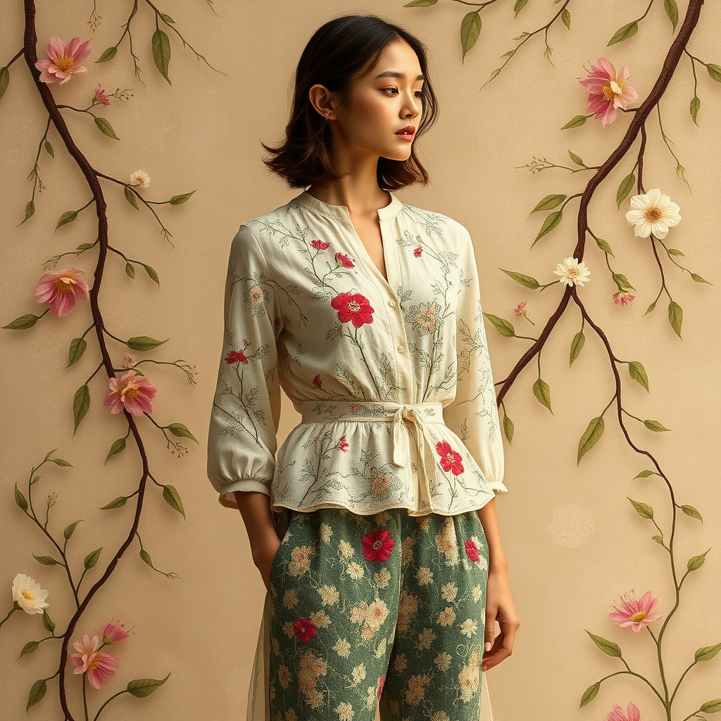 Imagine a fashion concept where elegance and nature intertwine, drawing inspiration from the intricate beauty of botanical elements. Picture a collection of clothing designs featuring delicately embroidered floral patterns that mimic the complexity of vines and blossoms. The fabrics used are rich in organic textures, such as soft cottons, flowing silks, and textured linens, all of which echo the subtle imperfections of nature. The color palette is a harmonious blend of muted earth tones, gentle greens, and vibrant floral hues, creating a natural yet sophisticated aesthetic. Each piece is designed with an effortless grace, as if it has been plucked from a serene garden, yet is perfectly wearable in any modern setting. This collection captures the essence of nature’s elegance, combining timeless floral motifs with contemporary silhouettes to create a wardrobe that is both refined and reminiscent of the tranquility found in the natural world.