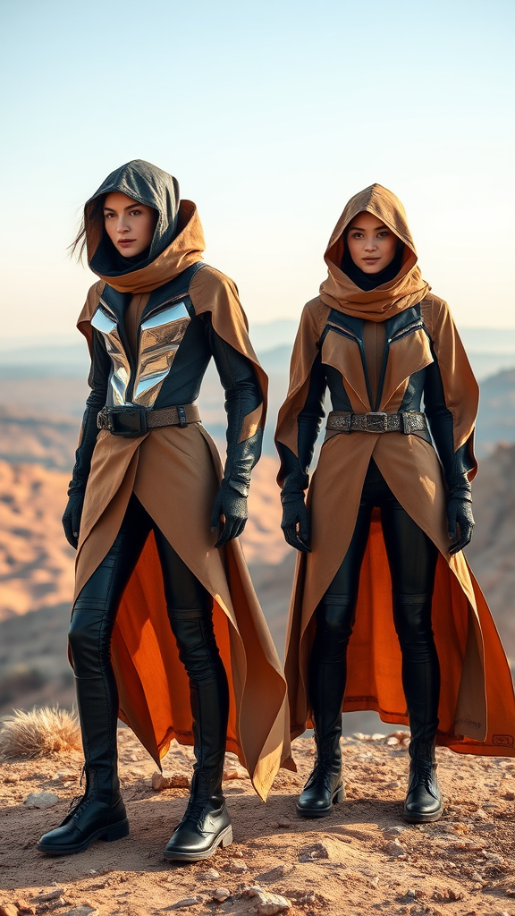 Imagine a fashion line where sleek, aerodynamic designs meet the earthy elements of a wanderer's world. The collection showcases garments crafted from cutting-edge smart fabrics that adapt to changing climates and environments. Each piece features layering systems for versatility, with integrated energy-harvesting technology to power wearable devices. The silhouettes are bold yet fluid, incorporating modular components that can be transformed or detached for different functions. Asymmetrical lines and reflective surfaces capture light, evoking the never-ending horizon that inspires the modern nomad. Earthy tones and metallic accents create a harmonious blend, symbolizing the union of nature and technology. This fashion line redefines mobility and self-expression in a society where the world is both a playground and a home.