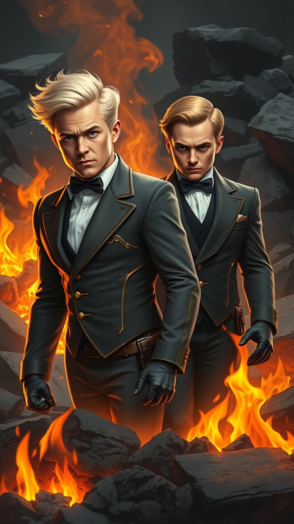 Imagine a full-body portrait of a very blond-haired Richie Rich-like male from the comics, alongside a Cadbury-like butler from comics, reimagined as superheroes emerging from smoldering ashes on rocky terrain. Their expressions are stern and resolute as they gaze directly at the viewer. The surrounding flames cast a warm glow on their intricately detailed costumes, which boast a sophisticated design with subtle hints of opulence and elegance. The scene is captured in sharp focus, with muted colors adding depth and emotion to the realistic, photography-like composition. The digital painting showcases extreme detail, every contour and texture rendered with precision, and softened by gentle lighting that enhances the profound emotional impact of the image.
