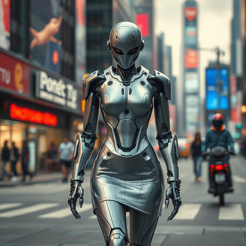 Imagine a futuristic scene in a bustling city where a highly advanced cyborg walks confidently down the street. This android possesses a faceless design with a sleek, shiny silver metal body. The figure wears a stylish mini skirt that adds a unique blend of modern fashion to its mechanical presence. The cityscape serves as a vibrant backdrop, teeming with life and movement. The cyborg looks directly at the viewer, its presence captured in a full-length, portrait-style photograph that emphasizes a photo-realistic representation with intricately detailed skin and meticulous attention to textures. The use of diffused soft lighting creates an inviting cinematic atmosphere, and the composition is captured with sharp focus and a shallow depth of field, embodying hyperrealism. Despite the lifelike representation, the scene holds a slightly surreal quality, offering a touch of creative interpretation to elevate the narrative.