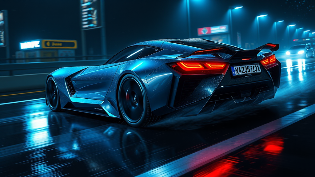 Imagine a futuristic sports car, a sleek amalgamation of BMW and Corvette design elements, its body coated in a shimmery metallic blue paint that gleams under the neon lights. The car exudes an aggressive aura, meticulously tuned for peak performance. It races down a wet road at high speed, tires skimming the slick surface as water sprays from beneath. The scene unfolds like a gripping movie action moment, set within an illegal racing game where daring maneuvers and intense rivalries define the night. The atmosphere is dark and moody, illuminated by the car's bright headlights cutting through the dimness, casting elongated shadows that flicker and dance. The environment resonates with neon underground aesthetics, reminiscent of a cyberpunk realm, echoing the gritty allure of Blade Runner. This landscape serves as a backdrop for a cinematic masterpiece captured in the style of digital painting, akin to a concept art tableau found on ArtStation. Intricate and highly detailed, the image showcases the car in its entirety—a masterpiece of photorealistic art rendered in sharp focus. Presented in 8k HDR, the composition boasts a shallow depth of field and broad lighting with high contrast. Backlighting accentuates the car's contours, with blooming light halos and delicate sparkles casting a surreal glow. Chromatic aberration adds a touch of realism, while colors remain vivid and true to their RAW state. The scene avoids distortion, maintaining clarity and impact, showcasing the elegance and ferocity of this unparalleled vehicle in a high-octane world.