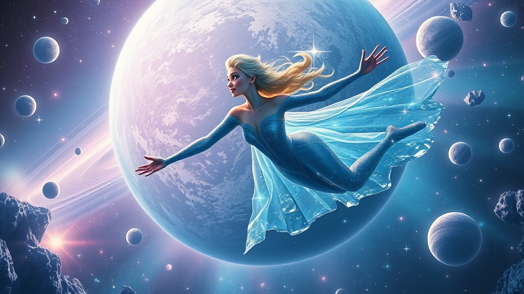 Imagine a hyper-realistic depiction of Elsa as a celestial deity flying gracefully through the cosmos, surrounded by a mesmerizing array of planets suspended around her. She soars majestically before an enormous, enchanting ice planet, its crystalline structures shimmering with magical energy. Elsa's features are striking and divine, exuding an aura of power and serenity, while her attire embodies her icy origins. The vast expanse of cold space is filled with a palette of neon glow-in-the-dark hues, casting an ethereal light on the scene. The intricate details of her divine garments and the cosmic surroundings enhance the otherworldly atmosphere, drawing the viewer into a vivid dreamscape.