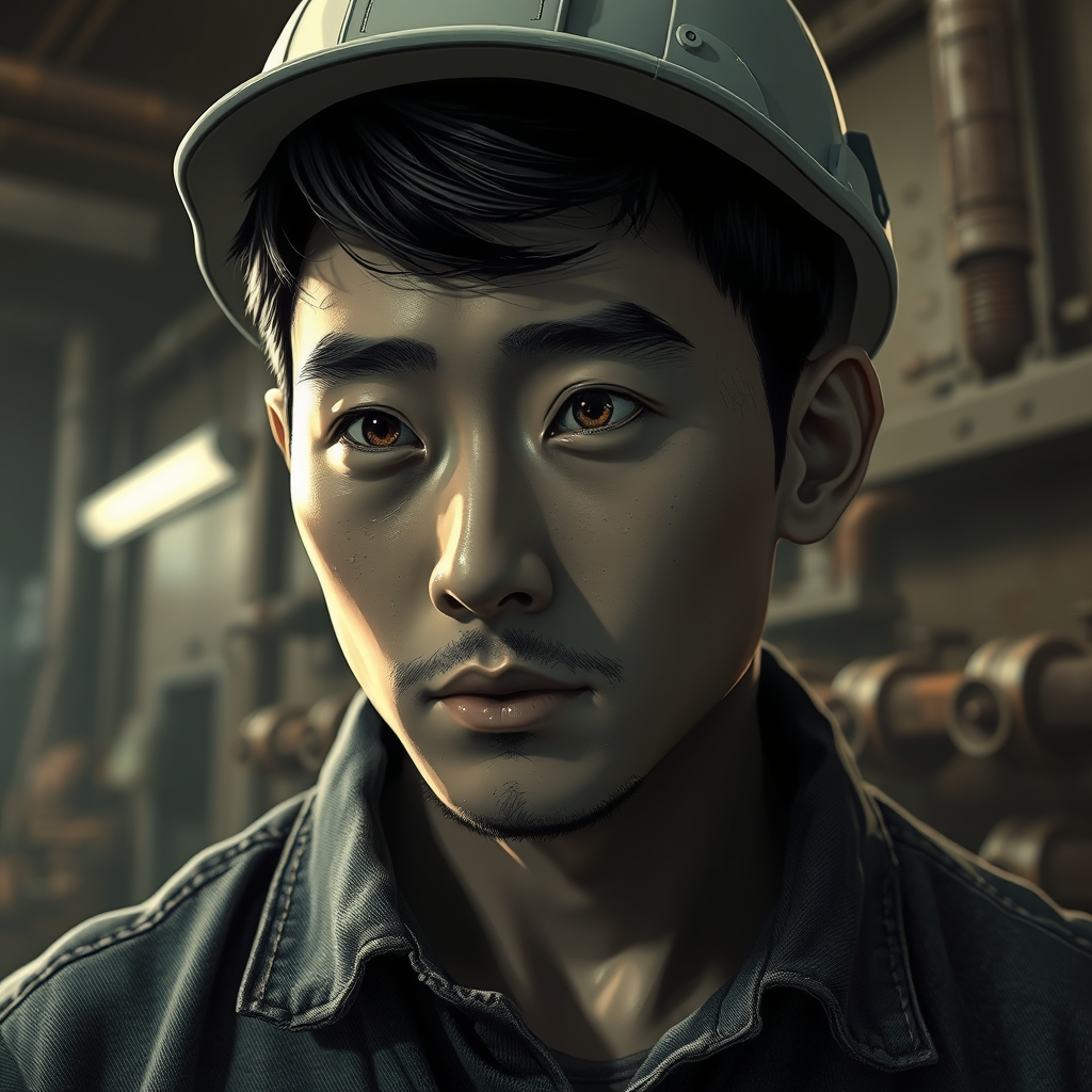 Imagine a mesmerizing artwork of a man depicted in an intriguing blend of soft luster and industrial mechanics. This piece captures a fantastical location within a rugged working environment, highlighting the harsh conditions faced by workers. The scene is a full-body, 8k unity render action shot, emphasizing detailed skin pores and an intricately designed iris. With very dark lighting creating heavy shadows, the focus remains on the detailed facial features. This digital painting employs the precision of octane render, reflecting the expertise found on ArtStation, and draws stylistic inspiration from artists like Artgerm, WLOP, and Ilya Kuvshinov. The artwork portrays an Asian man in black and white, with a sharp focus and smooth illustration. He's dressed in denim, depicted in a captivating cartoonish 3D style. This is a high-quality, high-resolution masterpiece, free from any artifacts, cropping issues, or low-quality elements, showcasing the beauty of a single moment within a rough industrial world.