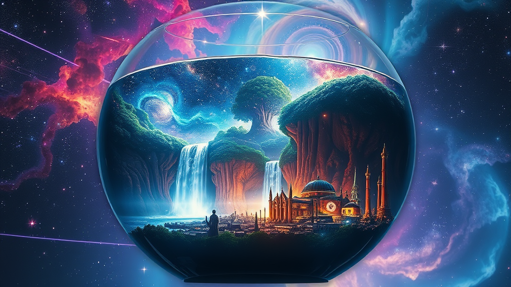 Imagine a mesmerizing scene: a vast universe encapsulated within a crystalline glassbowl, each layer revealing a different world teeming with life and mystery. The outermost layer glows with vibrant nebulas and swirling galaxies, their colors brilliantly merging in epic, hyper-realistic detail made possible by Unreal Engine 5.2's unmatched capabilities. Inside this cosmic shell, another world emerges, a lush, fantastical landscape filled with towering luminescent trees and cascading waterfalls that defy gravity, their waters shimmering in 8K quality with ethereal clarity. At the core, a microcosm of bustling cityscapes thrives, where futuristic architecture meets ancient ruins, all pulsating with the energy of a hidden civilization. The interplay of light and shadow across each layer creates a breathtaking spectacle of worlds within worlds, all suspended in the delicate transparency of a glassbowl, inviting endless exploration and wonder.