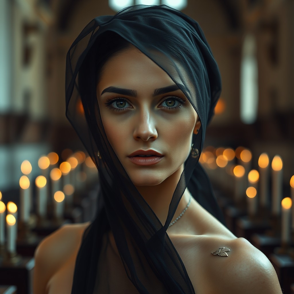 Imagine a portrait capturing the essence of a beautiful Spanish widow with a touch of melancholy yet elegance, inspired by the works of Nadav Kander and Annie Leibovitz. Her face is framed by a delicate black veil, accentuating her expressive eyebrows and lovely big bright eyes, giving her an angelic presence. The dramatic lighting highlights her confident expression, drawing attention to her simple earring and necklace decoration. The composition follows the golden ratio style, enhancing the cinematic quality akin to CinémaScope. She stands in a softly lit church adorned with candles, their gentle glow creating a stunning bokeh effect in the background. Her strapless attire adds a modern twist, and her serene appearance reminds one of the world's inherent beauty. The scene is intricately detailed, capturing an atmosphere of graceful solitude.