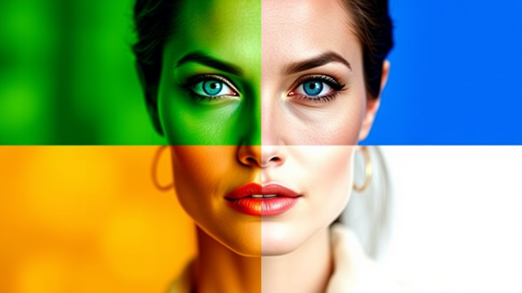 Imagine a portrait of Angelina Jolie, her face elegantly divided into four distinct squares, each representing a unique season. The top left square bursts with the vibrant green hues of spring, symbolizing renewal and growth. In the top right, a deep blue square captures the essence of a blazing summer, full of energy and intensity. The bottom left square transitions to yellow, evoking the crisp air of autumn adorned with gentle falling leaves, whispering of change. Finally, the bottom right square is cloaked in pure white, depicting the serene stillness of winter with delicate snowfall, embodying quiet and reflection. Each section merges seamlessly, together telling the story of the year through the timeless beauty.