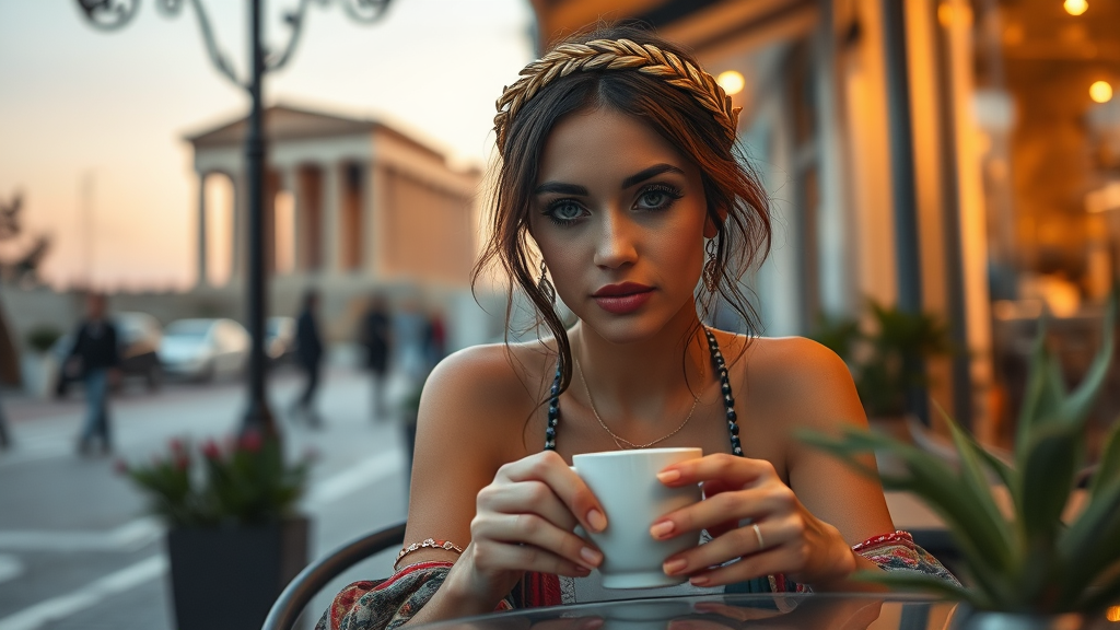 Imagine a scene capturing a modern bohemian vibe; a woman with striking, lifelike features is seated at a cozy street café in Athens. She's dressed in a stylish boho outfit, and a delicate golden laurel crown rests elegantly atop her head, reminiscent of ancient Greek tradition. The aroma of freshly brewed coffee fills the air as she savors her cup, lost in thought. In the dimming light of dusk, the Parthenon looms softly blurred in the background, adding a touch of historic charm to the contemporary setting. The atmosphere is a harmonious blend of classic elegance and modern serenity.