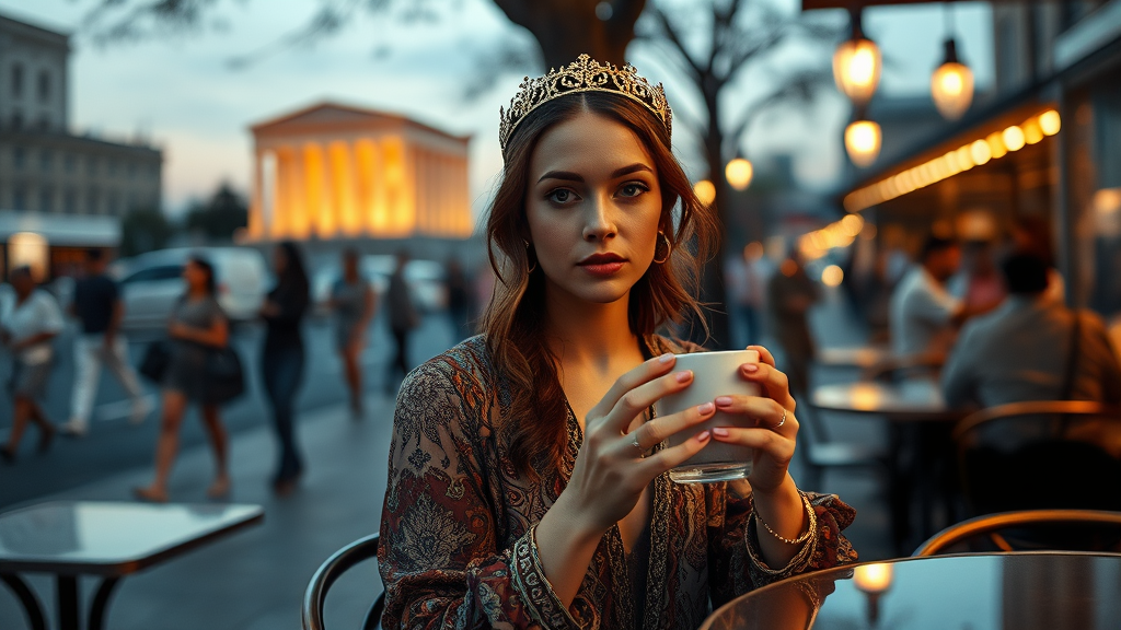 Imagine a scene of post-classical portrait photography featuring a woman in a boho outfit with intricate patterns, set against the backdrop of modern Athens. She's seated elegantly in a bustling street-side coffee shop, exuding grace and charm. A delicate gold crown inspired by Greek laurels adorns her head, catching the evening light. She's sipping her coffee with a serene expression, as the blurred silhouette of the Parthenon glows softly at dusk in the background, adding an historic ambiance to the modern setting.