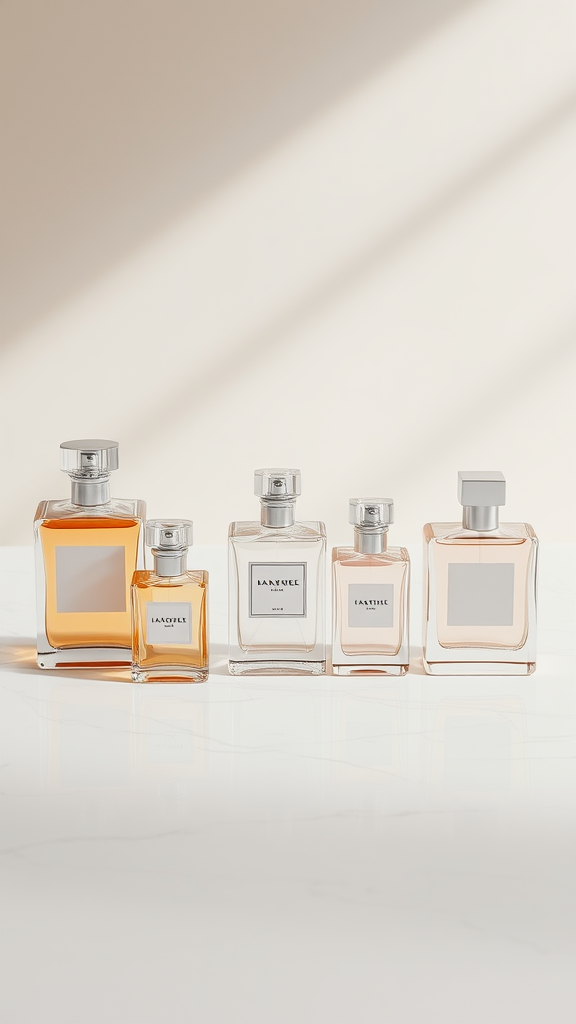 Imagine a serene and refined scene where a collection of perfume bottles rests gracefully on a sleek white marble surface. The bottles, differing in size and silhouette, all embody a theme of timeless elegance and sophistication. Each bottle showcases precise design, featuring clean lines and minimalist details like a discreet silver cap or a gentle, intricate etching. Though the bottles bear no labels, the fragrance hues inside suggest their aromatic character, presenting a palette that ranges from soft amber to blush pink. The background unfolds in a subtle gradient of ivory and champagne, with gentle plays of light that accentuate the luxurious essence of the composition. The scene exudes an air of quiet glamour and sophisticated allure, beckoning the viewer to imagine the captivating scents and the opulent sensation of wearing them.