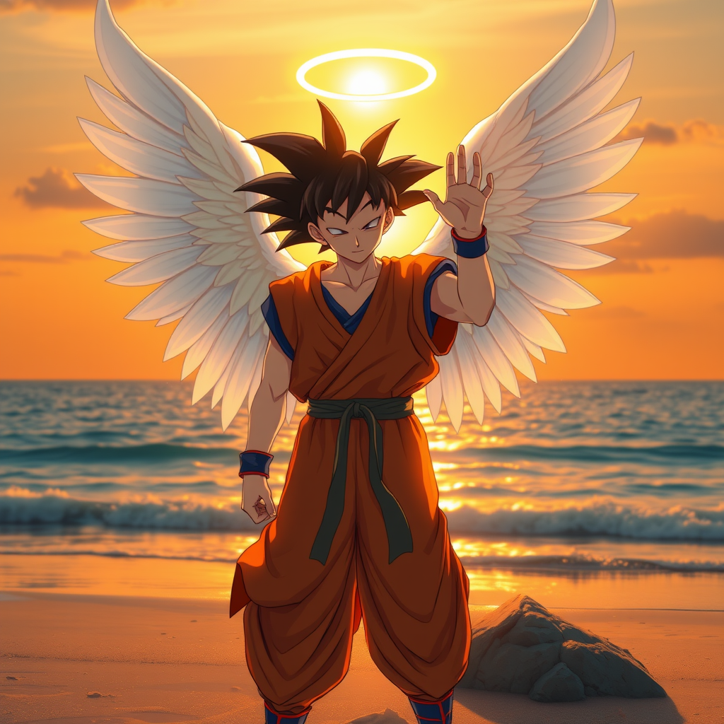 Imagine a serene scene where Toriyama Akira's iconic character Goku stands on a tranquil beach at sunset, his traditional orange gi fluttering in the gentle breeze. Behind him, brilliant white angel wings unfurl majestically, glowing softly in the golden light. A shimmering angelic halo floats just above his head, casting a gentle aura. With a serene, heartfelt expression, he waves goodbye to an unseen friend, the ocean reflecting the vibrant colors of the setting sun. The scene captures a moment of peaceful farewell, blending a sense of adventure with a touch of the ethereal.