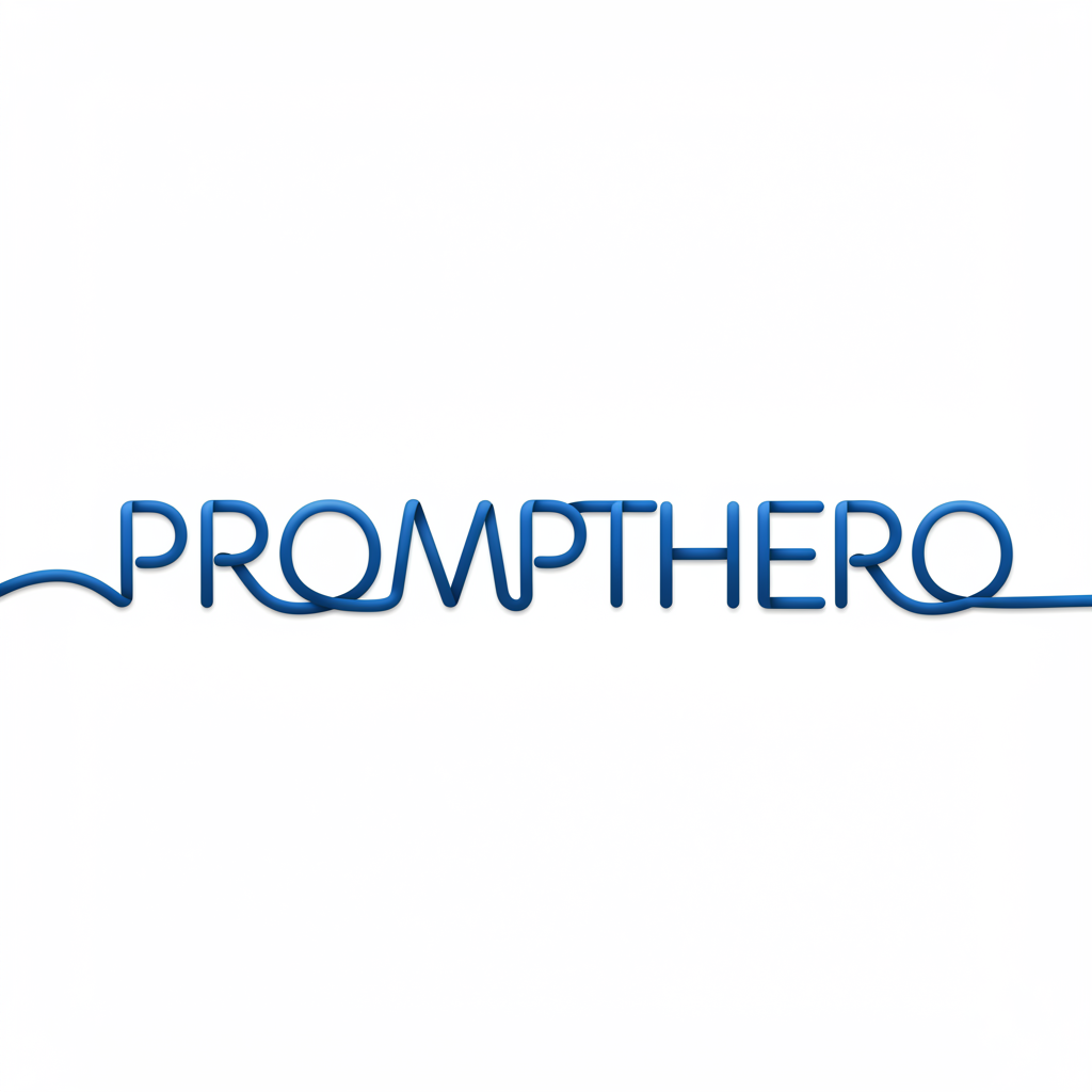 Imagine a sleek design of the word "PROMPTHERO" crafted from a continuous piece of blue silk ribbon set against a pristine white backdrop. The ribbon elegantly curves and spirals to form each letter seamlessly, with the negative space within the loops accentuating the letter shapes. This design embodies unity and resilience, with a composition that is both minimalist and intricate. The aesthetic is sophisticated, carrying a profound interpretation of connection and strength through the artful weaving of the ribbon.