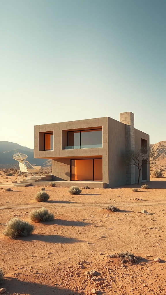 Imagine a small, modern villa set in a desert landscape, its aesthetic defined by Brown cubist architecture, blending elements of Bauhaus and futuristic design. As the sun rises, the villa’s ash-colored concrete surfaces take on a warm glow. The structure is without trees, emphasizing its cubic and geometric nature. The architecture is intricately detailed, capturing the eye with its ultra-realistic textures that give it an almost sculptural quality. Created using cutting-edge technology like Unreal Engine and Octane, the image radiates with 8k resolution, where each element is clear and de-noised. The villa sits perfectly centered within the wide-angle frame, presented with a cinematic flair reminiscent of high-end productions, powered by Vray rendering. The bright and hyper-realistic portrayal, trending on platforms such as ArtStation and CGSociety, feels like a fusion of art inspired by Jean Leon Gerome and Asher Brown Durand, capturing a vibrant juxtaposition between natural beauty and modern ingenuity.