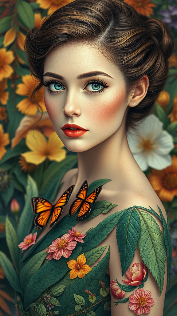 Imagine a stunning Russian girl with a vintage aesthetic. Her eyelashes are long and delicate, framing expressive eyes. She has a slender figure, adorned in a dress crafted from leaves, with flowers and butterflies intricately detailed within the design. The background is a vibrant composition of colorful plants, creating a dynamic and fantastical scene. The image is captured in ultra-high-definition, with careful attention to artistic detail and minimalistic elegance. It's a vivid, colorful depiction, blending a sense of beauty and fantasy seamlessly.