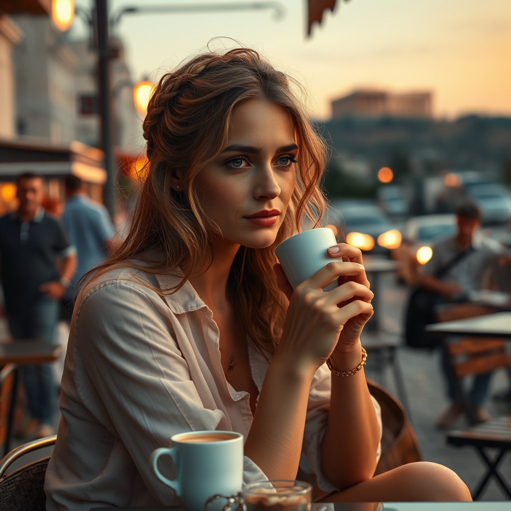 Imagine a super realistic woman in a post-classic portrait, dressed in a bohemian outfit, sitting at a quaint sidewalk cafe. Her hair is crowned with a delicate gold laurel wreath, capturing the spirit of ancient Greece. She sips coffee as the modern city of Athens buzzes around her, the soft glow of dusk casting a warm hue. In the background, a gently blurred Acropolis stands majestically against the twilight sky, offering a serene yet dynamic atmosphere that bridges past and present.