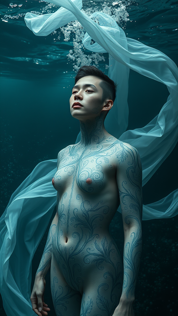 Imagine a surreal portrait of a human figure set against a backdrop of an intricate underwater world, where flowing fabrics ripple like ocean currents. The scene is awash with dark turquoise and light white hues, creating a mystical and serene atmosphere. The figure is adorned with detailed body-painting, featuring ultrafine patterns that mimic nature's motifs, such as swirling waves and delicate coral designs. The overall composition showcases exquisite attention to detail, capturing the harmonious blend of human and oceanic elements, evoking a sense of ethereal beauty and connection with the natural world.