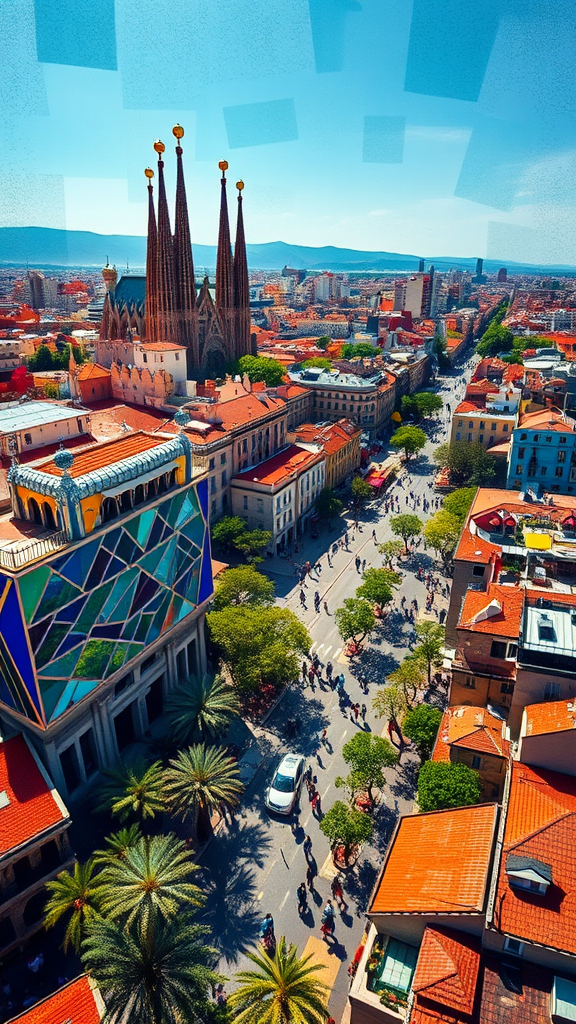 Imagine a sweeping, colorful vision of Barcelona, Spain, through Pablo Picasso's eyes. The cityscape unfolds in a Cubist style, filled with fragmented shapes and bold geometric forms. Sagrada Familia rises majestically with its intricate spires breaking into angular patterns, while Park Güell's serpentine benches twist and turn into abstract mosaics. La Rambla pulses with dynamic movement, its bustling energy splintered into vibrant, overlapping shards. A wide-angle perspective from a bird's-eye view captures the city's diverse architecture, where Gothic cathedrals blend seamlessly with modernist marvels. Rich hues dominate the canvas—intense blues of the Mediterranean sky, fiery reds from terracotta rooftops, warm yellows reflecting sunlight, and lush greens from scattered trees. The composition strikes a dynamic balance, reflecting Barcelona's vibrant pulse through the abstract lens of Cubism.