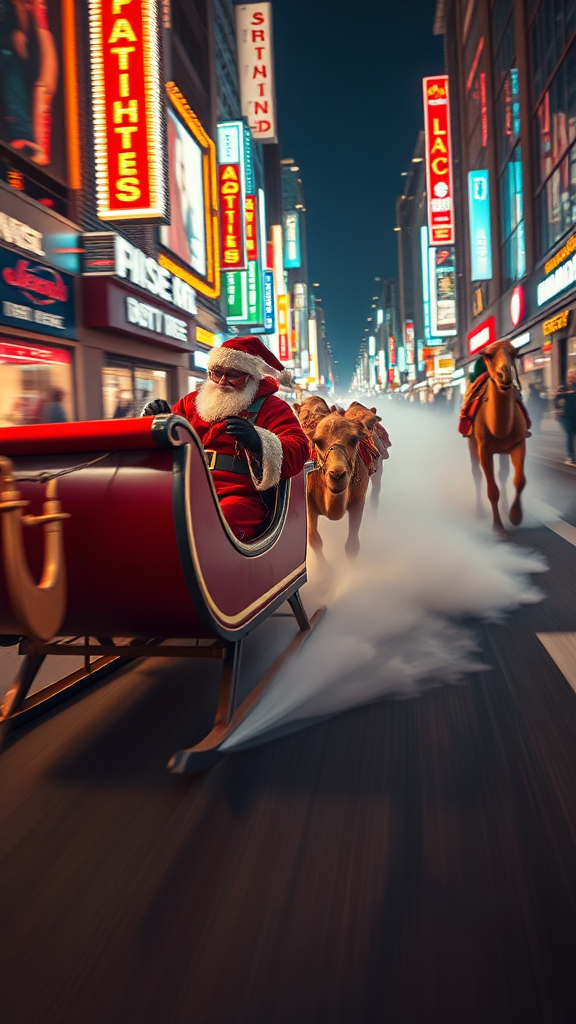 Imagine a thrilling video sequence featuring Santa Claus and The 3 Wise Men in a lively race, with Santa's sleigh and the Wise Men's camels kicking off the action by performing a burnout on a vibrant, bustling city street at night. The scene opens with a close-up of the sleigh and camels, capturing the excited neighing of the reindeer and camels. Transitioning to a wide shot, the visuals showcase the full profile of the sleigh and camels as they accelerate rapidly, leaving a cloud of smoke in their wake. The camera follows their swift movement with a steady hand, revealing the urban backdrop alive with neon lights that glisten off the sleigh and camels' surfaces. Maintaining a fast pace, the sequence encapsulates the exhilarating nature of the race, smoothly transitioning between close-ups and wide angles to create a captivating and cohesive visual experience.