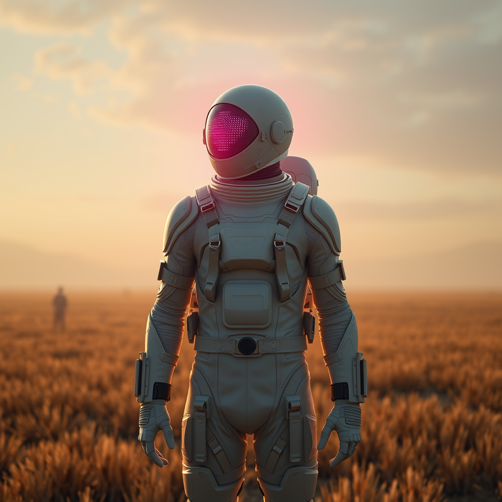 Imagine a vast, surreal landscape reminiscent of Death Stranding, with an anatomically correct human male figure clad in a futuristic astronaut suit. He stands in the middle of a vast field, facing forward, and his helmet emits a mesmerizing pink glow. The scene is bathed in dynamic, cinematic lighting, with hyper-detailed features and enhanced by ray tracing that casts dramatic flares and deep, mysterious shadows across the terrain. The rendering appears almost unrealistically sophisticated, similar to the cutting-edge capabilities of an advanced engine. Elements of the environment and figure are captured in a high-definition 3D style, creating a strikingly atmospheric composition --ar 9:16.