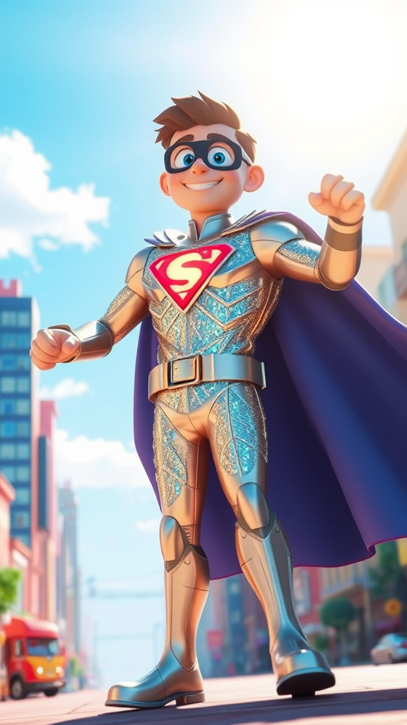 Imagine a vibrant 3D animated scene in the style of a Pixar film, featuring a superhero in a dazzling, full costume that shimmers in the sunlight. The atmosphere is cheerful and cinematic, with dynamic angles capturing the hero's confident stance and flowing cape. The background is a colorful cityscape under a bright blue sky, with stylized buildings casting soft shadows. The overall style blends whimsical elements with a polished, high-definition finish, emphasizing the hero's engaging personality and sense of adventure.