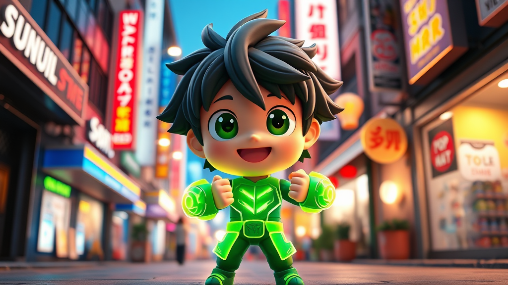 Imagine a vibrant city street scene featuring a super cute and chibi-style 3D figure of Izuku Midoriya. He's depicted with large, expressive eyes that exude happiness, capturing his energetic and optimistic personality. The setting is illuminated by bright street lights, creating a lively and dynamic atmosphere. The figure is rendered with meticulous detail using C4D and OC renderer, embodying a blend of Pixar inspiration and pop art style. His body is designed with a luminous, fluorescent translucency that gives him a doll-like, kawaii appearance. The backdrop features a Magic Space Warehouse theme, adding a whimsical touch to the scene. Izuku is in a dynamic pose with closed fists, surrounded by elements suggestive of toys and collectibles, inspired by pop mart blind box designs. The entire image is in striking 8K resolution, showcasing high details under studio lighting conditions. This adorable depiction of Izuku Midoriya embraces the essence of chibi and SD characters, while the creative enhancements in colors and textures give it a unique pop culture twist.