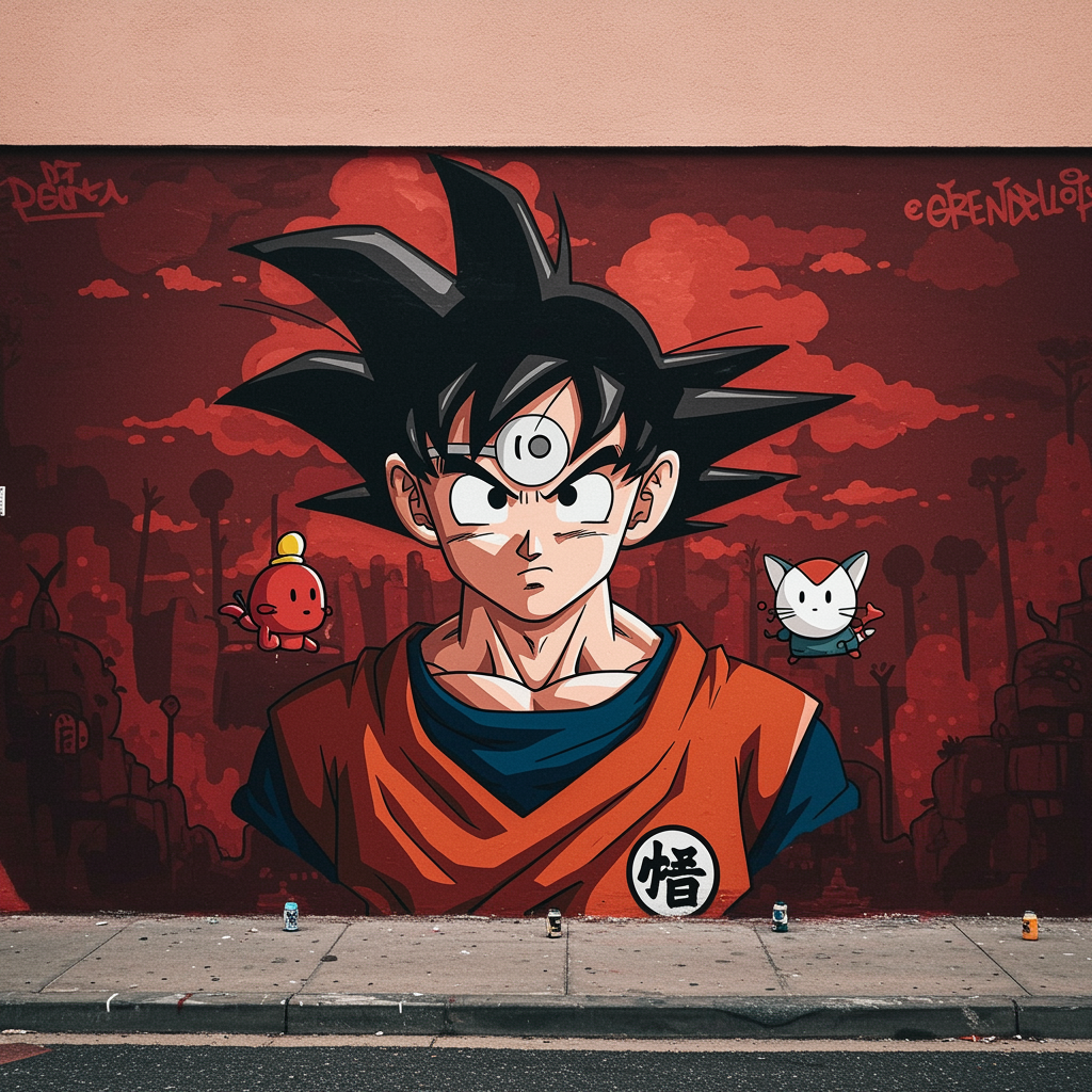 Imagine a vibrant mural featuring a portrait of Dr. Goku, rendered in the style of a street art aesthetic, combining cute cartoonish designs with advanced photo-realistic techniques. The piece is dominated by a dark red color scheme, capturing the nostalgia of childhood arcadias. The composition embraces an anime aesthetic with cartoon-like figures, achieving an unexpected blend of whimsy and realism. This artwork captures the essence of youthful adventure and the dynamic energy of Dragon Ball with a contemporary twist.