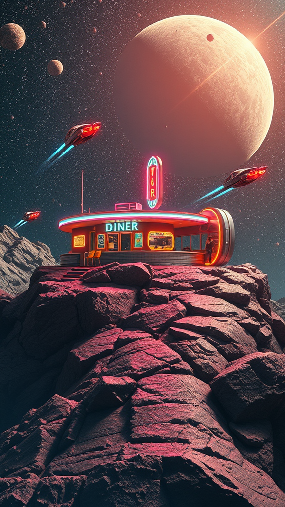 Imagine a vibrant scene set in a retro-futuristic 1950s-style diner perched on the rugged surface of an asteroid, surrounded by the vastness of space. The diner glows with neon signs and colorful lights, casting dynamic reflections on the rocky terrain. Flying cars zip through the starry expanse, leaving luminous trails behind them. The asteroid belt in the background shimmers with countless tiny cosmic bodies, adding to the intricate details of the scene. This kaleidoscope of colors and motion is captured in stunning 4K resolution, highlighting every retro detail and imaginative element of this space-age diner setting.