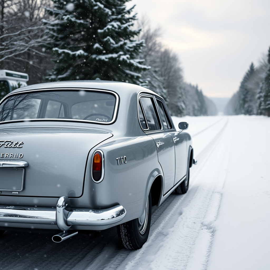 Imagine a vintage 1960 silver Fiat Tipo 2018 sedan gracefully navigating a snow-covered road in a serene winter landscape, captured in hyper-realistic detail. The scene features intricate reflections on the car's polished exterior, with snowflakes gently falling around it and the soft, diffused light of an overcast sky enhancing the timeless elegance of the classic vehicle.