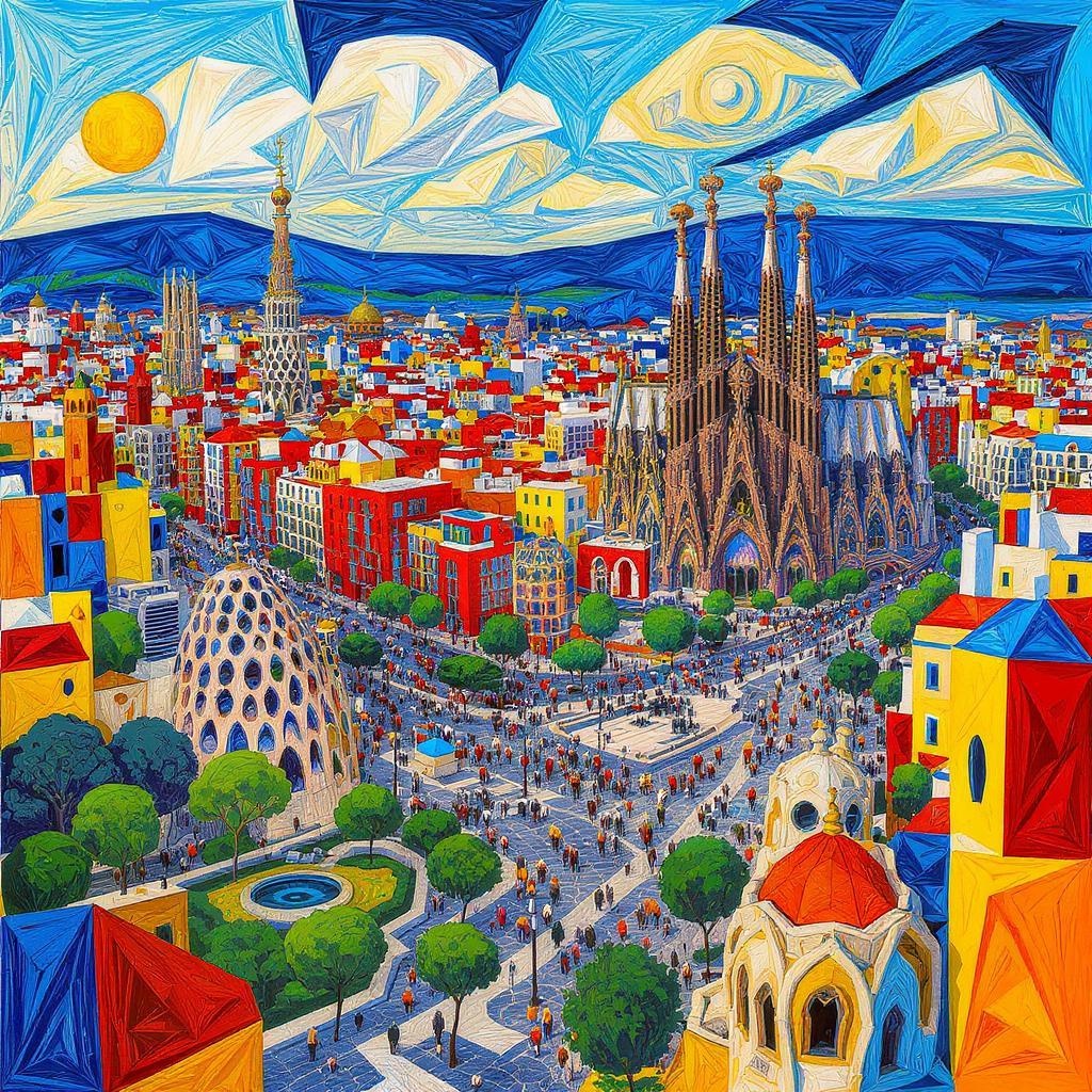 Imagine a vivid and colorful depiction of Barcelona, Spain, as if seen through the eyes of Pablo Picasso, blending the essence of Cubism with a lively cityscape. The scene is alive with fragmented shapes and bold geometric forms, showcasing iconic landmarks like the Sagrada Familia, Park Güell, and the bustling La Rambla. Captured from a high vantage point with a wide-angle perspective, the city unfolds in a tapestry of diverse architecture and energetic streets. The composition thrives on a rich, vibrant color palette reminiscent of Picasso's signature style, with dominating hues of blues, reds, yellows, and greens. The frame captures a dynamic balance, marrying the city's zest with the abstract flair of Cubism, while allowing small playful variations that enrich the overall visual narrative.