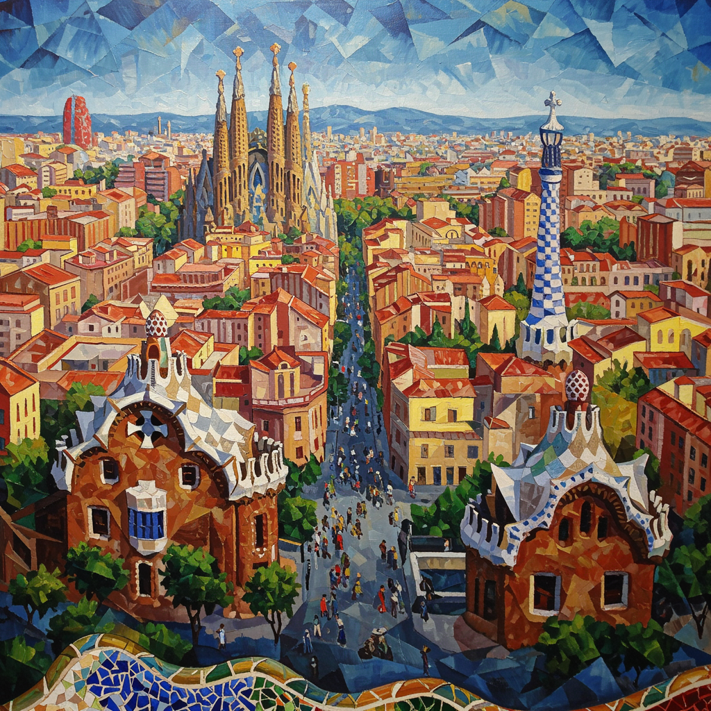 Imagine a vivid and colorful depiction of Barcelona, Spain, through the eyes of Pablo Picasso, where the cityscape unfolds in a Cubist splendor. Fragmented shapes and bold geometric forms create a kaleidoscope of sights, capturing iconic landmarks like the towering spires of Sagrada Familia, the whimsical mosaics of Park Güell, and the lively stretch of La Rambla. The wide-angle view from a high vantage point reveals a bustling tapestry of diverse architecture and vibrant streets. The color palette is rich and lush, dominated by deep blues, fiery reds, golden yellows, and verdant greens that echo Picasso's unique style. The composition achieves a dynamic balance, merging the city's energy with the abstract forms of Cubism, resulting in a scene that pulsates with life and creativity, offering small delightful twists while preserving the essence of Picasso’s vision.
