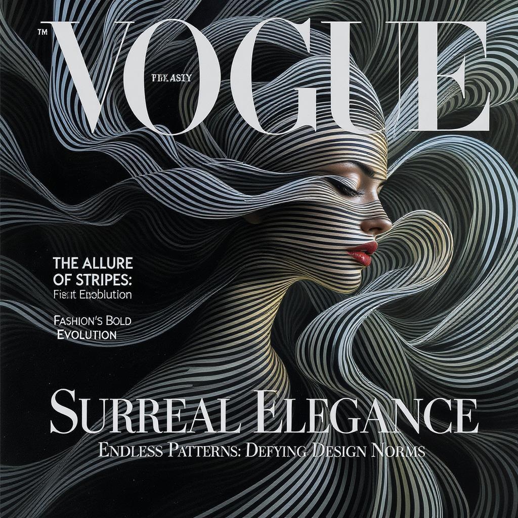 Imagine a VOGUE magazine cover featuring an enchanting woman enveloped in a mesmerizing labyrinth of swirling stripes. These lines dance and spiral around her, seamlessly merging her silhouette with the dynamic, dreamlike pattern. Her expression is serene, with her face subtly obscured by the hypnotic waves of stripes, giving her an ethereal, otherworldly aura. The VOGUE logo stands bold at the top, its metallic sheen striking against the abstract backdrop. The cover headlines read: "The Allure of Stripes: Fashion’s Bold Evolution," "Surreal Elegance: Where Art and Style Converge," "Endless Patterns: Defying Design Norms."