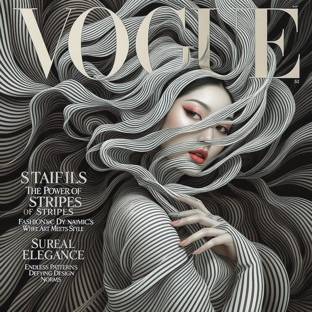 Imagine a VOGUE magazine cover featuring an enchanting Chinese woman enveloped in a mesmerizing cascade of swirling stripes. The lines twist and spiral around her, seamlessly merging her form into the dynamic, surreal pattern. Her serene expression is partially obscured by the hypnotic waves of stripes, giving her an ethereal, otherworldly aura. The VOGUE logo stands boldly at the top, metallic and striking against the abstract design. Cover highlights boast: "The Power of Stripes: Fashion’s Dynamic New Era," "Surreal Elegance: Where Art Meets Style," and "Endless Patterns: Defying Design Norms."