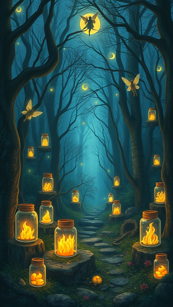 Imagine a world where dreams are collected by night fairies and stored in glowing jars scattered throughout a mystical forest, where each jar reveals the hidden desires and fears of its dreamer.