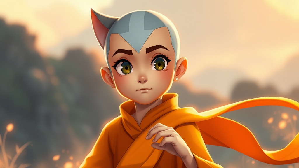 Imagine a youthful avatar with an air of wisdom, his vibrant orange robes flowing gracefully. His features reflect the essence of Aang, the last airbender, yet presented in an anthropomorphic style reminiscent of art from Furaffinity. His eyes shine with curiosity and determination, a hint of playfulness dancing in his expression. The landscape around him glows softly, casting a warm ambiance. His stance is dynamic, one hand poised slightly forward as if ready to summon the elements. Embracing unique artistic touches, subtle variations in the geometry of his robes and the texture of his skin suggest a world slightly altered, yet deeply connected to the familiar spirit and energy of Aang's journey.