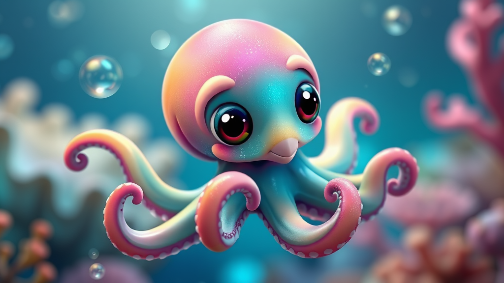 Imagine an adorable baby octopus with large, expressive eyes, its tentacles playfully curled in a whimsical dance. The vibrant colors of its smooth, glistening skin reflect a spectrum of cheerful hues, reminiscent of a Pixar animation, exuding an aura of irresistible charm. With a playful twist, the octopus interacts with its underwater environment, engaging in cute antics that showcase its curious nature amid a landscape of softly glowing coral reefs and gentle, cascading bubbles that sparkle with a magical, dreamlike quality.