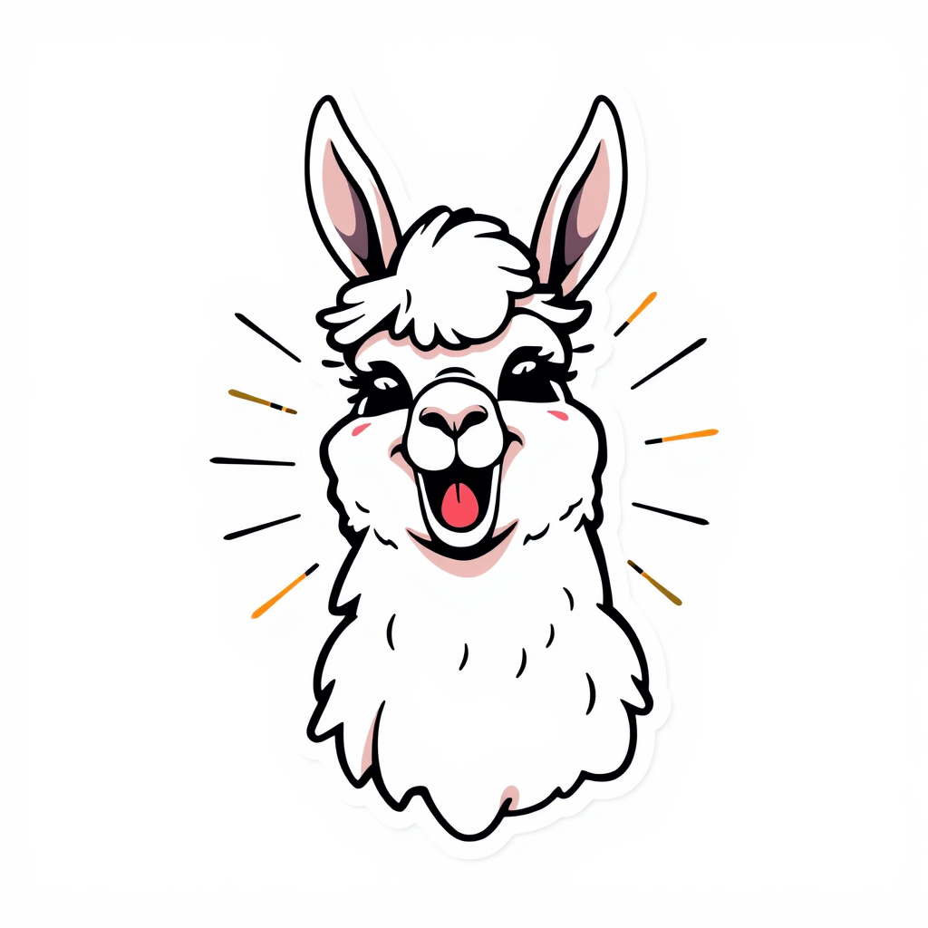 Imagine an adorable llama portrayed in a spirited and joyous style, radiating fun and happiness. The design features the llama with a cheeky look, perhaps with its tongue playfully sticking out or adorned with a whimsical hat. Utilize bright, bold colors and dynamic, flowing lines to encapsulate its lively spirit, crafting an engaging and charming visual. The design, perfect for a sticker, should be vector-based with a clear outline, set against a clean white background, adding a unique touch with subtle creative tweaks while maintaining the essence of the original concept.