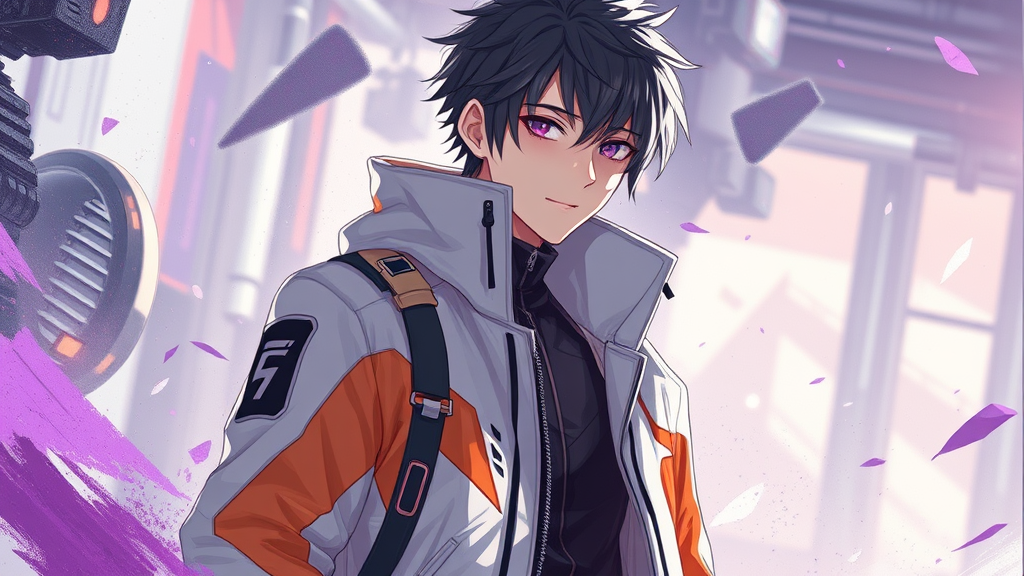 Imagine an anime character clad in a sleek white and orange jacket, designed in a cyberpunk aesthetic with a palette of dark white and soft violet tones. The artwork showcases precise brushwork and a sense of automatism, reflecting an air of official art with lucid portrayals of intricate themes. The character is surrounded by a world of high detail, capturing both futuristic elements and subtle nuances of their environment, blending seamlessly with creative enhancements to highlight their dynamic presence.